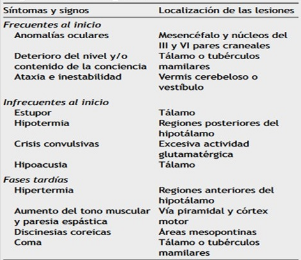 Mientras la oftalmoplejía y la ataxia se asocian al compromiso de la protuberancia y de la placa cuadrigeminal, la confusión se relaciona con el daño del tálamo y de los cuerpos mamilares. Si bien en la literatura hay numerosos trabajos que comunican diferencias entre la encefalopatía de Wernicke de origen alcohólico y no alcohólico, las lesiones características son iguales en ambas.(5)