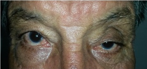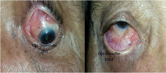 Paciente de 68 años de edad, de color de piel blanca, masculino, saludable previamente, que acudió a consulta de Oftalmología por presentar caída del párpado superior del ojo izquierdo (OI). Durante el examen físico se constató la presencia de ptosis palpebral, (Figura 1), aumento de volumen a nivel de conjuntiva bulbar superior de poca movilidad, tortuosidad vascular y pequeñas microhemorragias. En el ojo derecho (OD) se observó retracción del párpado inferior, aumento de volumen a nivel de conjuntiva bulbar inferior, con poca movilidad, tortuosidad vascular y calcificaciones. (Figura 2). El resto del examen ocular resultó sin alteraciones.