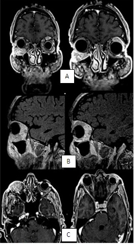 Se le realizó una resonancia magnética nuclear (RMN) con secuencias de órbitas y administración de gadolinio, en la cual se comprobó la existencia de masa heterogénea en el espacio extraconal bilateral, que ganaba en intensidad después de estudio endovenoso. Se observó compromiso de los músculos rectos, inferior en el OD y superior en el OI, sin infiltrar otras estructuras. (Figura 3).