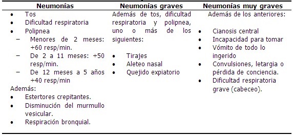 Las Guías Prácticas de la Organización Panamericana de la Salud del año 2009 recomiendan, para cuando no sea posible contar con radiografía de tórax, considerar según el cuadro clínico: neumonías, neumonías graves y neumonías muy graves. (Cuadro 1). (22)