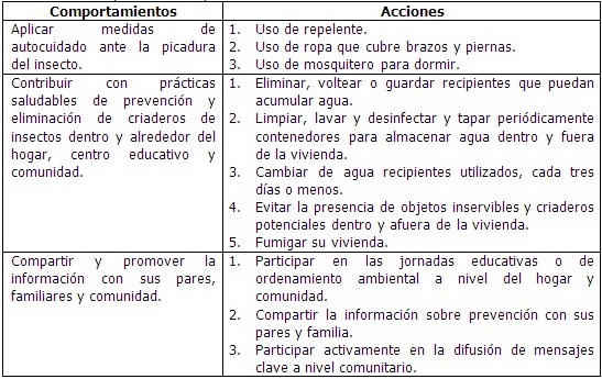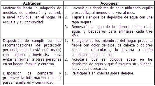 El objetivo principal de la estrategia comunicativa fue promover actitudes (Cuadro 1) y comportamientos (Cuadro 2) para reducir la exposición a factores de riesgo de arbovirosis.