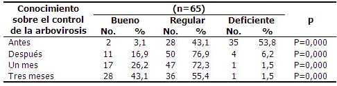 Con respecto al control de las arbovirosis, antes de la intervención solo dos estudiantes refirieron tener un buen conocimiento, y 35 se catalogaron como deficientes, situación que después de la intervención fue revertida: 28 con un buen conocimiento, y solo un estudiante deficiente. (Tabla 2).