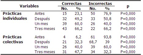 El 49,2 % de los escolares manifestó desarrollar prácticas individuales correctas de prevención y control de las arbovirosis, lo que se incrementó al mes a 60,0 %, y a los tres meses a 66,2 %. Algo similar ocurrió con las prácticas colectivas; ambas con significación estadística. (Tabla 3).
