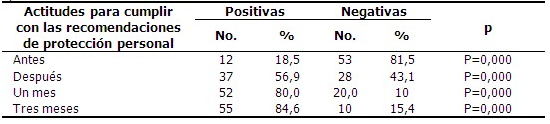 Concerniente a las actitudes de disposición de cumplir con las recomendaciones de protección personal, en la post intervención, 56,9 % de los educandos, mostró actitudes positivas, cifra que ascendió a 80,0 % y a 84,6 %, al mes y tres meses, respectivamente; resultados estadísticamente significativos. (Tabla 4).