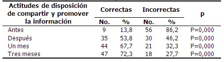En relación a las actitudes para compartir y promover la información sobre la prevención y control de las arbovirosis, en la post intervención 53,8 % de los escolares mostró actitudes correctas con sus pares, familiares y comunidad, lo que al mes llegó a un 67,7 %, y a los tres meses fue de 72,3 %, también correspondiendo a diferencias significativas. (Tabla 5).