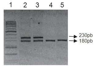 La técnica de la digestión enzimática permitió confirmar la presencia de la mutación p.L708P. En la electroforesis se mostró el control heterocigótico positivo para esta, el cual presentó el sitio de restricción para la enzima AluI en uno de sus alelos, fragmento 230pb. El paciente que tuvo el cambio conformacional a, presentó las bandas, 180pb y 50pb, el último fragmento no se encontró en la electroforesis, pues migró con el frente de corrida. La única paciente con trastornos de los factores de la coagulación exhibió los fragmentos 230pb, 180pb y 50pb, por lo que resultó heterocigótica para la variante p.L708P.