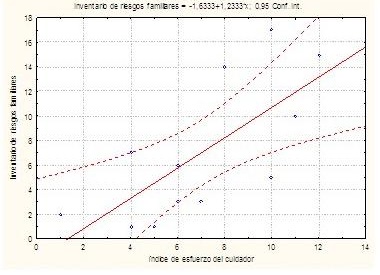 Finalmente, se observó una relación positiva entre el índice de esfuerzo del cuidador y el inventario de riesgos familiares. (Gráfico 3).