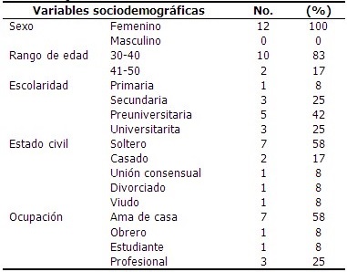 La serie de casos estuvo compuesta por 12 CP del sexo femenino, predominando el rango de edad entre 30 y 40 años, con una edad media de 36 (DE ±6). Predominaron las CP con escolaridad preuniversitaria, solteras y amas de casa. (Tabla 1).