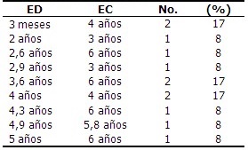 El 50 % de los niños fueron del sexo femenino, y el 50 % del sexo masculino. Se identificó coincidencia entre la ED y la EC en 2 niños (17 %), el resto se encontraron por debajo de su EC (83 %). (Tabla 2).