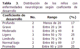 El 58 % de los niños fueron diagnosticados de PCI (7 niños); 17 % de encefalopatías (2 niños); 17 % RDPM (2 niños) y 8 % con TDI (1 niño).