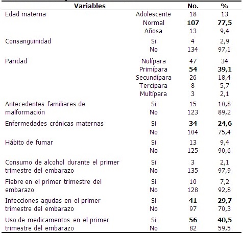 Con respecto a los factores maternos, predominó el grupo de edad normal (77,5 %), sobre las adolescentes y añosas; y las gestantes con historia obstétrica de primiparidad (39,1%). El 24,6 % de ellas presentó alguna enfermedad crónica, y el 40,5 % ingirió algún medicamento durante el primer trimestre de embarazo. (Tabla 1).