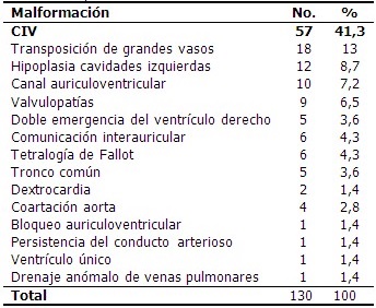En cuanto al tipo de malformación, se evidenció un amplio predominio de la comunicación interventricular (CIV) con 41,3 % (57 casos), seguida de la transposición de grandes vasos (13 %), y por la hipoplasia de cavidades izquierdas (8,7 %). Prevalecieron los defectos por afectación en el tabicamiento cardiaco o de sus tractos de salida. (Tabla 2).