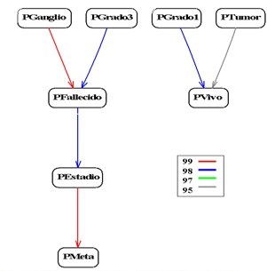 En el grafo implicativo normal es posible observar las relaciones que se establecen entre todo el conjunto de variables definidas, así como la intensidad y el sentido de cada implicación. Por ejemplo, en el ya citado estudio Moraga y colaboradores,6 figura un grafo implicativo donde se aprecia que un grado histológico I (PGrado1) implicó estar vivo, con una probabilidad de certeza (intensidad implicativa) igual o superior al 98 %; además, un grado histológico III (PGrado3) y la presencia de ganglios (PGanglio) implicaron haber fallecido, con una probabilidad de certeza igual o superior al 98 % y 99 %, respectivamente. (Figura 2).