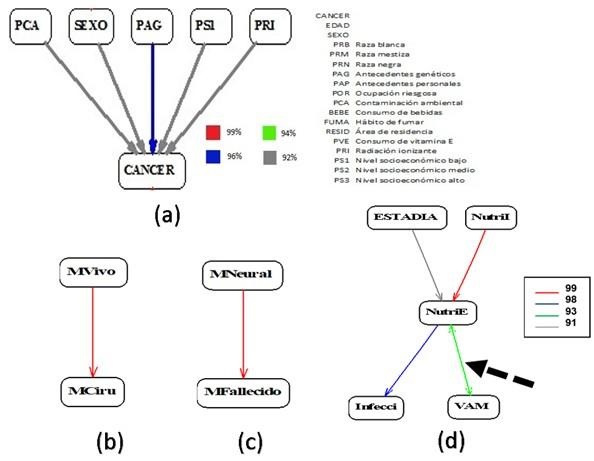 En el estudio de García Mederos y colaboradores,5 el cono del grafo implicativo para la identificación de factores de riesgo del cáncer de pulmón, está representado por la variable que identifica tener cáncer (CANCER), de manera que las variables que aparecen unidas al cono por flechas se consideran los factores de riesgo asociados al cáncer: la contaminación ambiental (PCA), el sexo (SEXO), los antecedentes genéticos (PAG), el nivel socioeconómico bajo (PS1) y la radiación ionizante (PRI) (3a). (Figura 3) Moraga y colaboradores,7 muestran otro grafo implicativo (3b) que permite identificar que, recibir tratamiento quirúrgico (MCiru) es un factor de buen pronóstico, porque se asocia con el evento favorable, que es estar vivo (MVivo). De igual forma, otro grafo implicativo (3c) permite identificar que la invasión perineural (MNeural) es un factor de mal pronóstico, porque se asocia con el evento desfavorable fallecer (MFallecido). (Figura 3).