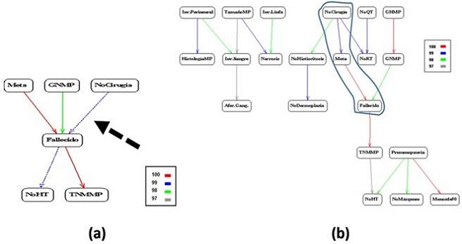 Por ejemplo, en el grafo de la figura 4a (Figura 4) se aprecia que el no haberse operado (NoCirugía) incide en el fallecido a través de otra u otras variables que deben explorarse en el grafo implicativo normal (4b), o sea, que el no haberse operado es causa indirecta del desenlace. En este caso la metástasis es una variable intermedia, entonces la cadena causal sería: no operarse conllevó a tener metástasis, y esto, a fallecer.