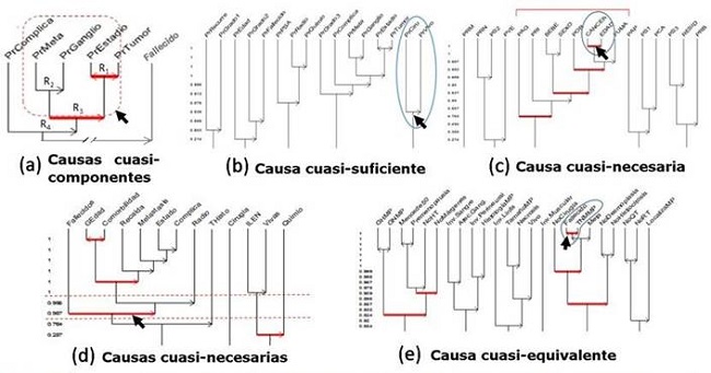 Teniendo en cuenta el modelo de Rothman27,28y la terminología cuasi-implicativa, se han creado cuatro tipos de causas: cuasi-componentes, cuasi-suficiente, cuasi-necesaria y cuasi-equivalente (cuasi-suficiente y cuasi-necesaria a la vez), las cuales se explican a continuación. Estos tipos de causas se identifican básicamente a partir de las reglas obtenidas del árbol cohesitivo.