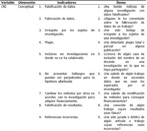 La dimensión conceptual estuvo referida al conocimiento adquirido desde las posibles experiencias del sujeto respecto a prácticas que denotan una irresponsable conducta en investigación. Compuesto por 9 indicadores e igual número de ítems, se consideró escaso conocimiento en este aspecto, cuando la respuesta fue afirmativa en 4 o menos preguntas; algún conocimiento, cuando fue afirmativa en 5 a 7; y suficiente, 8 o 9 respuestas afirmativas.