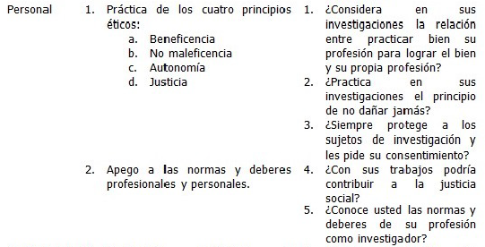 La dimensión personal tuvo que ver con el cumplimiento de los principios éticos de la investigación, y, por tanto, con la actitud personal ante la CRI. Para esta se plantearon 3 indicadores, correspondientes a 5 ítems en la encuesta. La respuesta afirmativa para la totalidad de ellas se tradujo en que sí asume una CRI; para 3 o 4 afirmativas, que asume medianamente una CRI; y para 2 o 3 afirmativas, que no asume una CRI.