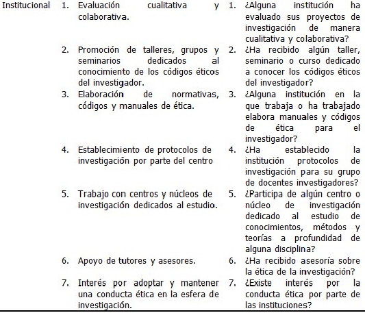 Results: in the conceptual dimension, there was little knowledge about situations of non-responsible behavior in research in 64.29% of the professors surveyed. Only in 28.6% show that they are individually responsible. Regarding the role of educational institutions in general, the vast majority, 58.6%, expressed that they show some interest in the topic.