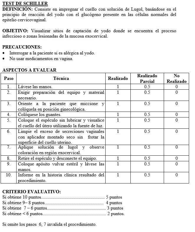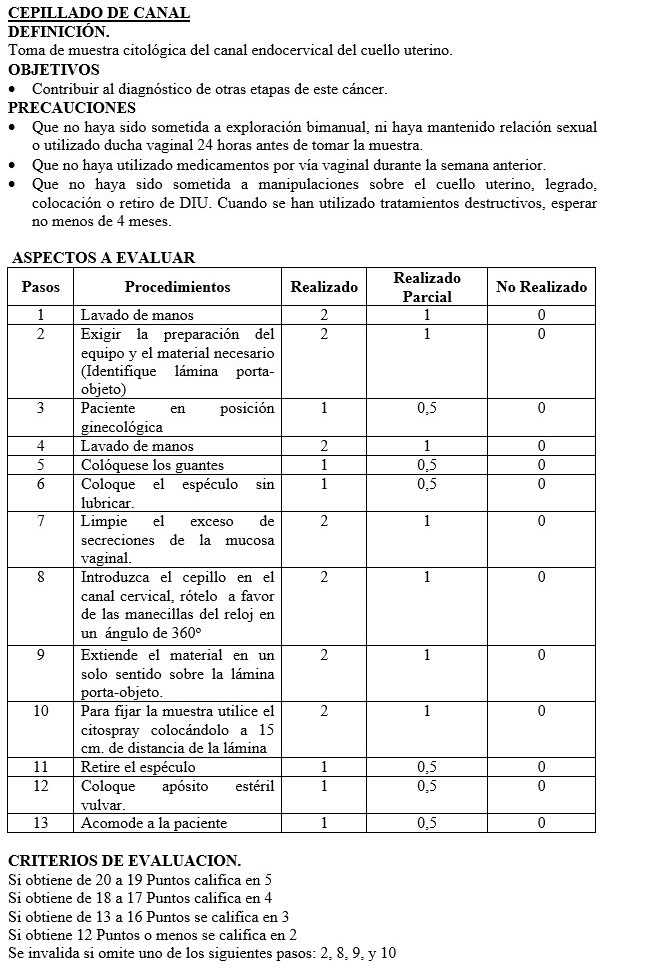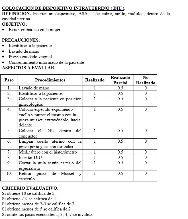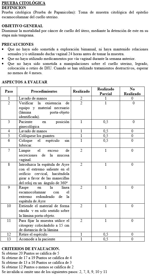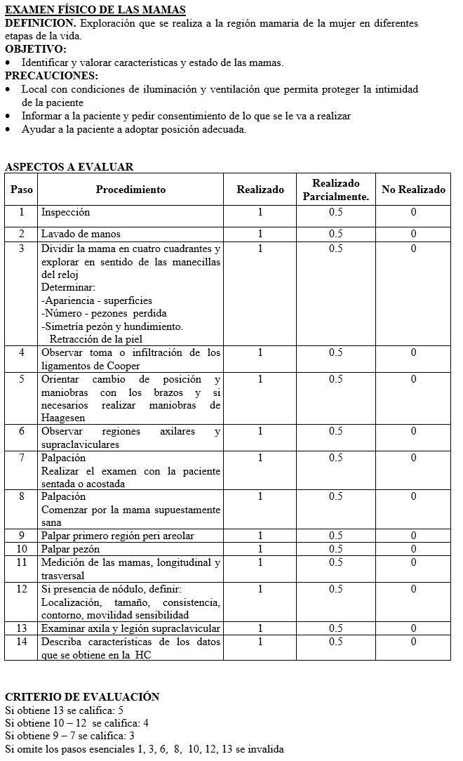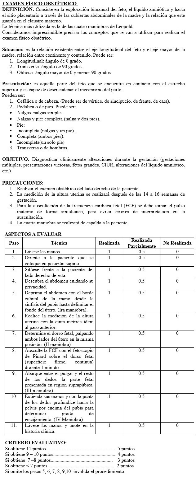 Resultados: la guía incluye la evaluación de las siguientes habilidades clínicas: examen físico obstétrico, auscultación de la frecuencia cardiaca fetal, examen físico de la puérpera, examen físico de las mamas, colocación y extracción de dispositivo intrauterino, prueba citológica, cepillado de canal y realización de test de Schiller.