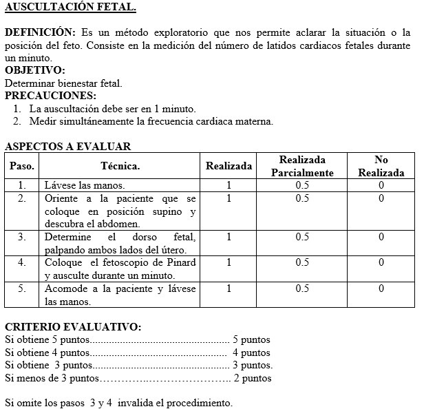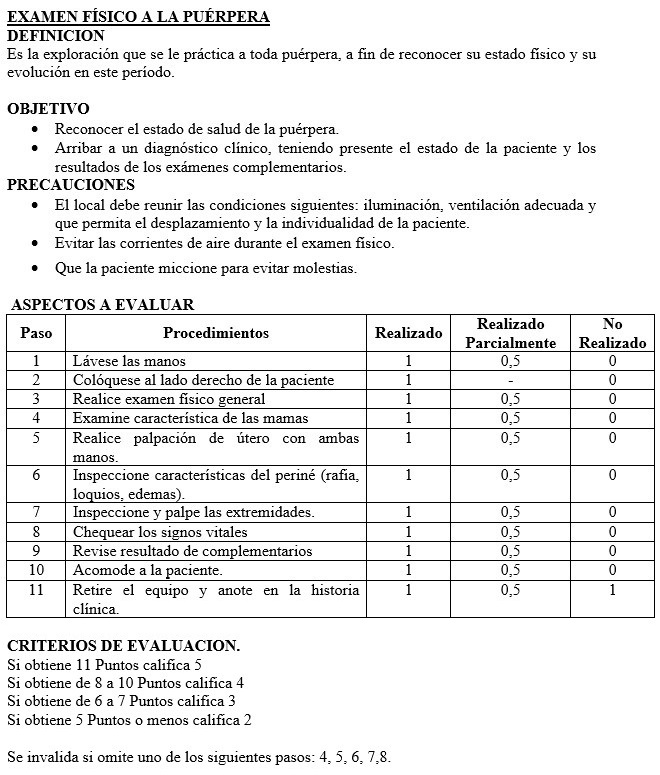 Results: the guide includes the evaluation of the following clinical skills: physical obstetric examination, auscultation of the fetal heart rate, physical examination of the postpartum woman, physical examination of the breasts, placement and removal of intrauterine device, cytological test, canal brushing and Schiller test.