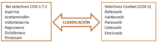 Forman un grupo numeroso de fármacos heterogéneos que comparten acciones terapéuticas y efectos adversos. Eficaces frente a dolores leves a moderados. Deben de utilizarse a la menor dosis posible, el menor tiempo posible y utilizar el menos tóxico posible acorde con las necesidades de inhibición de COX-1/COX-2.4
