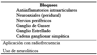 Se aplican en centros especializados que cumplan con determinados requerimientos. En los últimos años se han impulsado técnicas mínimamente invasivas que se realizan de manera percutánea para la colocación de medicación en una estructura diana causante de dolor. Los bloqueos de los estímulos nociceptivos contribuyen a disminuir la respuesta al estrés quirúrgico, bloquean las vías de conducción del dolor.