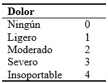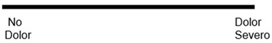 Escala visual análoga: consiste en una raya horizontal de 10 cms. en cuyos extremos se contrapone No dolor y dolor máximo, el paciente marcará con un punto el sitio en que presenta el dolor.