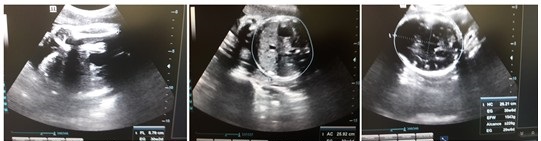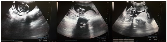 La gestación que la trajo en un segundo momento a los servicios obstétricos, constituyó un resultado importante. Se consideró como de alto riesgo obstétrico, y se realizaron orientaciones específicas para el seguimiento en la atención prenatal, al existir altas probabilidades de morbimortalidad perinatal. La evolución clínica ha sido favorable hasta el tercer trimestre, sin patologías propias o asociadas al embarazo, y con curvas de peso, tensión arterial y de altura uterina acordes al período de gravidez. Se realizó ecografía obstétrica correspondiente al período gestacional, que confirmó el completo bienestar materno fetal. (Figura 3).