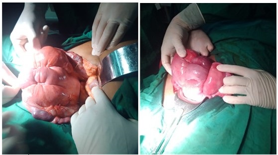 El examen físico reveló como datos positivos: bioparámetros en límites normales, útero grávido con altura uterina de 39 cm, presentación cefálica, dorso izquierdo, movimientos fetales referidos, dinámica uterina de 1 en 10 minutos de 30 segundos de duración, tono uterino normal y frecuencia cardiaca fetal de 142 latidos por minutos. Mediante especuloscopia se constató cuello permeable, con salida de líquido amniótico meconial fluido a través de orificio cervical externo y test de Bishop de 8 puntos. Durante la inducción del parto, existió conservación del bienestar materno-fetal, el patrón contráctil se mostró en correspondencia con la etapa del proceso inductivo y la progresión del trabajo de parto y descenso de la presentación fue adecuada, produciéndose parto eutócico a las seis horas del comienzo de la inducción. Se extrajo recién nacido femenino con test de Apgar 8/9 y peso de 4320 g. Se constató hemorragia obstétrica mayor por atonía uterina (pérdida aproximada del 40 % de la volemia). Se activó la Comisión Materna Extremadamente Grave (CMEG), y se comienzó con el tratamiento medicamentoso, protocolo de transfusión masiva y el uso de balón endouterino, los cuales no fueron efectivos para resolver el cuadro hemorrágico. Se decidió realizar laparotomía exploradora y cirugía conservadora del útero mediante técnicas quirúrgicas combinadas (suturas compresivas de Hayman, de Ho-Cho y ligadura bilateral de las arterias uterinas). Se logró la contractilidad uterina y disminución del sangrado en el propio acto quirúrgico. (Figura 2).