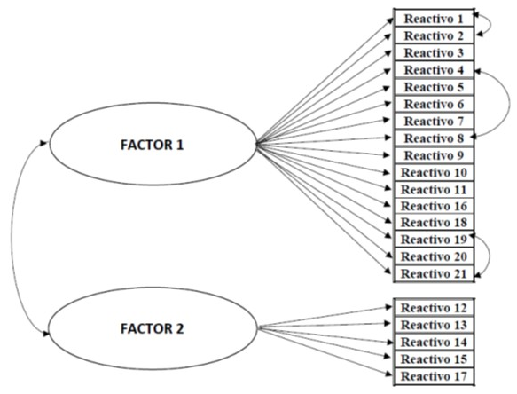 En lo referente a los índices de ajuste para el modelo confirmatorio según algunos autores,(16,17) existen índices de ajuste [Error de Aproximación Cuadrático Medio (RMSEA), que mide la cuantía de error del modelo (<0,06), Índice de Ajuste Comparativo (CFI) (oscila entre 0 y 1, siendo el valor de >0,90 el requerido para defender el modelo), Índice de Normado de Ajuste (NFI), que evalúa la disminución del estadístico χ2 del modelo adoptado respecto al modelo base (>0,90), finalmente el Índice de Bondad de Ajuste (GFI) que mide la cantidad relativa de varianza explicada por el modelo y determina si el modelo debe ser ajustado (>0,90)]. Los resultados del modelo en esta investigación son: RMSEA= 0,06, CFI= 0,94, NFI= 0,86, GFI= 0,90, χ2(492,39), (p <0,00), χ2/df =2,66, que denotan buenos índices de ajuste para un modelo basado en dos factores y que incluye los 21 reactivos. (Figura 1).