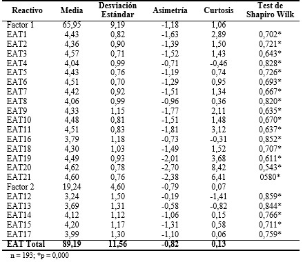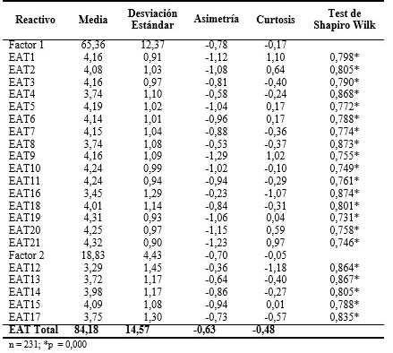 La curtosis como una medida estadística de apuntamiento, permite ver el grado de concentración que presentan los valores de una variable alrededor de la zona central de la distribución de frecuencias. Los resultados de las medidas indican que cuatro de los 21 reactivos tenían una distribución leptocúrtica; no existieron reactivos con distribución mesocúrtica y 17 reactivos tenían una distribución platocúrtica, por lo que hay una tendencia a que la EAT tenga una forma platocúrtica.