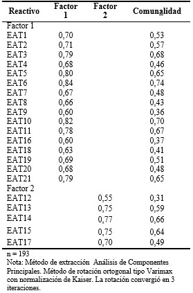 La versión original de la EAT agrupaba los 21 reactivos en tres factores con un alfa de Cronbach total alto (α = 0,92); no obstante, hacían falta datos sobre su estructura factorial, lo cual fue uno de los motivos para analizar sus propiedades en la investigación aquí reportada. Se realizó un análisis factorial tratando de reproducir un modelo de tres factores tal y como lo planteaban los autores de la EAT, aunque se encontró que existía una agrupación confusa de los reactivos, por lo se forzó la estructura a dos factores; en un segundo momento, se confirmó la estructura con medidas de ajuste, se obtuvo su consistencia interna y la correlación entre los factores; se obtuvieron sus medidas descriptivas y se compararon los resultados agrupando a los participantes de acuerdo con algunas condiciones sociodemográficas.