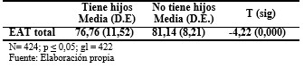 Se obtuvieron los puntajes mínimo (40) y máximo (105) de la EAT total, su media (86,46 + 13,50), datos que pueden servir de referencia en futuras investigaciones en grupos donde se aplique la escala y permitirían ubicar los resultados de los participantes.