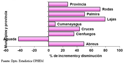 Al cierre de la semana epidemiológica 16 incrementan sus tasas el 87,5 % de los municipios de la provincia (Cienfuegos, Cruces, Cumanayagua, Palmira, Abreus, Lajas y Rodas). Solo disminuye en el municipio de Aguada, en relación a igual periodo del pasado año. (Gráfico 3).
