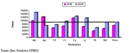 La tasa acumulada provincial hasta la semana 16 en el año 2020 es de 11813,2 por 100 000 hab.; se observó por encima en los municipios de Abreus (18235,4), Cumanayagua (17623,3), Lajas (16841,4) y Rodas (12442,9), seguido del municipio de Aguada. (Gráfico 4).