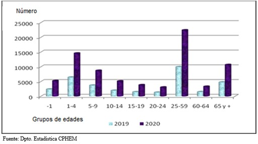 Al revisar el comportamiento de las IRA por grupos de edades, se observaron las tasas más altas de atenciones médicas en los menores de cinco años (48,7 % del total). Los mayores de 20 años representaron el 51,3 % de los casos diagnosticados con IRA; de ellos el grupo de edades de 25-59 aportó el 56,7 % del total de los casos de la población adulta. El grupo de 65 y más representó el 35,5 % del total de casos con IRA. (Gráfico 5).