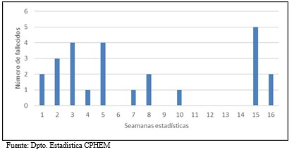 Se reportó en el periodo analizado un total de 25 fallecidos por IRA, observándose un mayor número de fallecidos en las cinco primeras semanas del año. La semana estadística 15 fue la de mayor número de fallecidos con cinco. (Grafico 7).