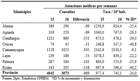 Las atenciones médicas por IRA en la semana estadística 16 disminuyen en un 24,0 % al ser comparadas con la semana 15 de este mismo año 2020; se observó igual comportamiento en todos los municipios. Se destaca que los municipios de Cumanayagua, Abreus, Lajas y Aguada, presentan tasas mayores a la provincial. (Tabla 1).