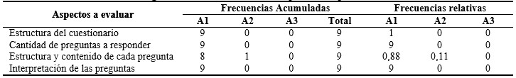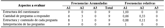 En la validación del cuestionario, en la primera ronda, tres de los aspectos evaluados: la estructura del cuestionario, estructura y contenido así como la interpretación de las preguntas alcanzaron la categoría de éxito por lo que no fue necesario realizar modificaciones en este sentido. En el aspecto cantidad de preguntas a responder obtuvo 15 puntos, seis expertos lo votaron como adecuada y 3 poco adecuada, se evaluó como aceptable y se realizaron modificaciones, se eliminaron dos preguntas. (Tabla 1).