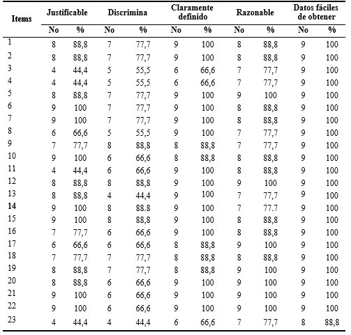 El resultado de la primera ronda con respecto a los criterios de Moriyama mostró que en la categoría justificable se calificaron como adecuados 17 ítems, en la categoría discrimina 10 alcanzaron valores superiores al 70 %, en las categorías claramente definido, razonable y datos fáciles de obtener los ítems fueron votados como adecuados por el 100 % de los expertos. Con estos resultados se realizaron las modificaciones de contenido correspondientes y se presentó a la segunda ronda de análisis por los expertos. (Tabla 2).