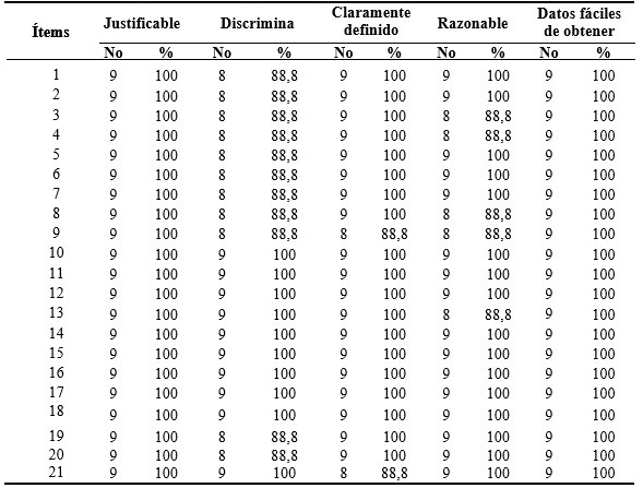 La evaluación de contenido en la segunda ronda mostró que el 100 % de los ítems resultaron adecuados para el 100 % de los expertos, por lo que no fueron necesarias nuevas modificaciones en este sentido. (Tabla 4).
