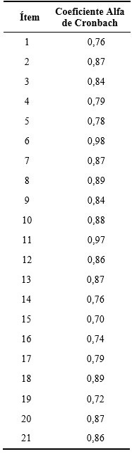 El coeficiente alfa de Cronbach fue igual o mayor de 0,70 en cada ítem, como se muestra en la tabla 5, por lo que todos se mantuvieron en el cuestionario.