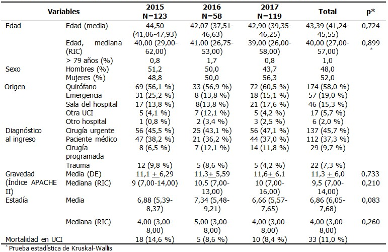 La mediana para estaba variable y su rango intercuartil se estimó en 40 años (RIC, 27,0-57,0). No se observó un incremento significativo en el tiempo de la media ni la mediana de edad. El 1,0 % de los enfermos tuvo una edad mayor de 79 años y el 52 % perteneció al sexo femenino. El 58 % de los atendidos en la UCI procedieron del quirófano, el 19 % de la sala de hospitalización y el 15,3 % de Emergencia; dichos servicios fueron los lugares principales de procedencia. El diagnóstico más frecuente al ingreso fue la operación urgente (45,7 %), seguido de las afecciones médicas (37,3 %), la operación programada (9,7 %) y los traumatismos (7,3 %). El valor promedio (desviación estándar) del APACHE II fue de 11,3 + 6,0 y la mediana (rango intercuartil) de 9,5 (RIC, 7,0-14,0), sin demostrarse aumento significativo del puntaje del índice pronóstico en años. La media de la estadía en UCI y su intervalo de confianza, se situaron en 6,8 días (IC 95 %, 6,0-7,6); la mediana fue de 4 días, y su rango intercuartil de 6,0-7,6. La mortalidad en la UCI fue de 11,0 %. (Tabla 1).