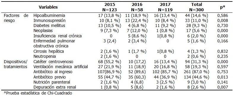 La hipoalbuminemia (14,6 %), la inmunosupresión (11,0 %) y la diabetes mellitus (9,3 %) se manifestaron como factores de riesgo más frecuentes. Otros lo fueron menos, pero la comparación de algunas variables fue estadísticamente significativa. En cuanto a pacientes con dispositivos se constató que al 31,3 % se le implantó catéter centrovenoso y el 19,3 % recibió ventilación mecánica artificial. El 87 % de los enfermos tuvo tratamiento antibiótico al ingreso, el 44,6 % tratamiento antibiótico previo; al 9,3 % se le indicó nutrición parenteral y al 2,6 % depuración extrarenal. (Tabla 2).