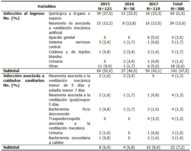 Las infecciones relacionadas con el cuidado sanitario o adquiridas en la UCI fueron aquellas que aparecieron 48 horas después del ingreso, tales como: neumonía asociada a ventilación mecánica (NAVM), bacteriemia foco desconocido, bacteriemia secundaria a catéter, infección urinaria, traqueobronquitis asociada a ventilación mecánica, infección superficial herida quirúrgica, neumonía no asociada a ventilación mecánica, bacteriemia secundaria a infección respiratoria, bacteriemia secundaria a infección abdominal, traqueobronquitis no asociada a ventilación mecánica, infección profunda herida quirúrgica, infección del sistema nervioso central, bacteriemia secundaria a otro foco, infección quirúrgica de órgano o espacio, infección cutánea y tejidos blandos, infección de la cavidad oral, peritonitis sin herida quirúrgica, infección nariz y senos, infección ocular e infección del aparato genital.