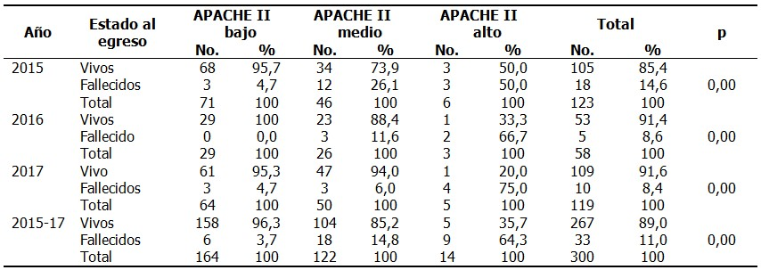 Al analizar la tendencia de la mortalidad e índice de APACHE II estratificado según nivel de gravedad, se observó que en los pacientes con APACHE II bajo, la mortalidad en el periodo que abarcó el estudio fue de 3,7 %, de 14,8 % cuando fue medio y 64,3 % cuando fue alto, con diferencias estadísticamente significativas. La tendencia global fue similar a la que se expresó por años. (Tabla 4).