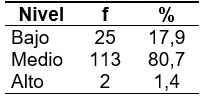 El análisis de los niveles de estrés laboral en los docentes peruanos evidenció una mayor proporción en el nivel medio (80,7 %), seguido del nivel bajo (17,9 %) y del alto (1,4 %). (Tabla 1).