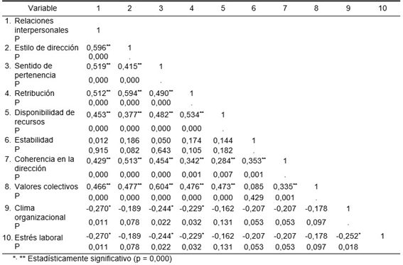 Results: a predominance of the medium level (80.7%) of work stress was found; and of the high level (78.6%) for the organizational climate. The correlation analysis showed a negative, highly significant association between the study variables.