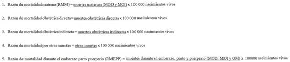 Las tasas y razones de la mortalidad materna se expresaron de la forma siguiente:(20)